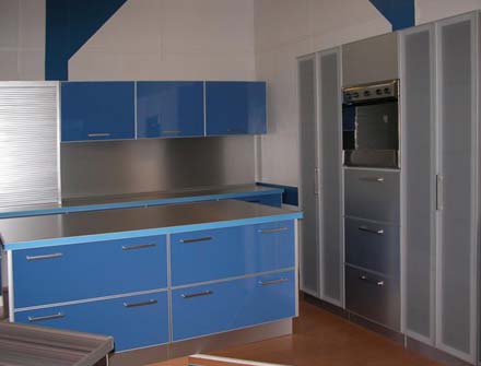 Кухня в стиле hi-tech, голубые глянцевые фасады в сочетании и серыми «металлическими». Вместительные выкатные системы хранения. Кухонные гарнитуры разных размеров. Разработка и сопровождение дизайн-проекта.